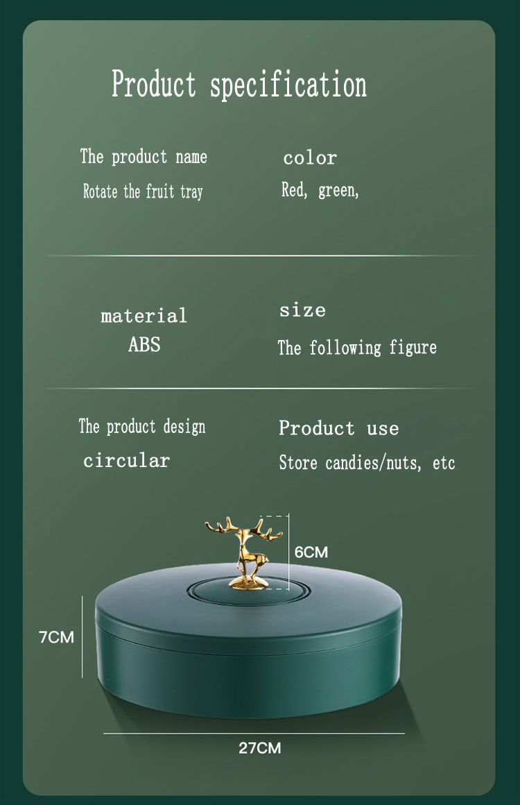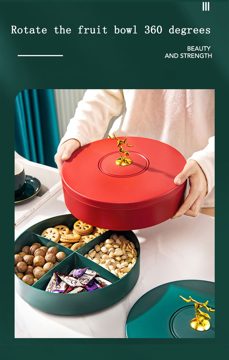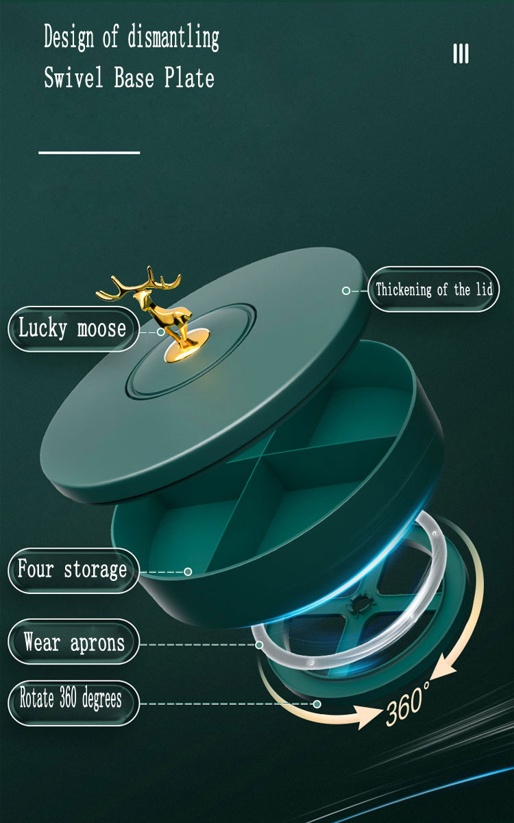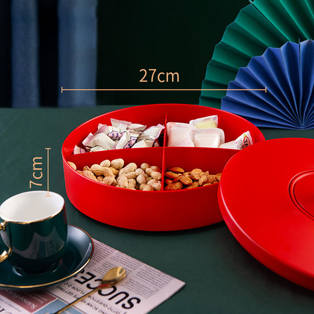 Kreatiewe ontwerp, rotasie oop pret klein lewe, maklik om te draai, kan die boks oopmaak, 'n verskeidenheid kosaanbieding, baie gerieflik. Ideaal om versnaperinge, koekies, skyfies, neute, kerse, sjokolade, droëvrugte en meer te vertoon. Rotary Switch: draai die klein blomskakelaar liggies aan die bokant van die snackbakkie, dit is maklik om die skinkbord oop te maak of toe te maak.