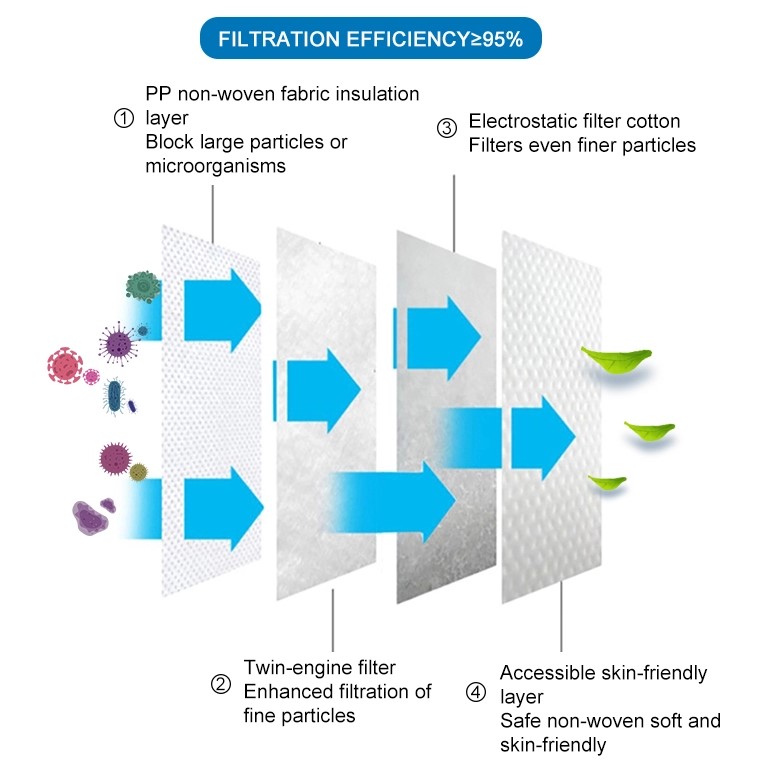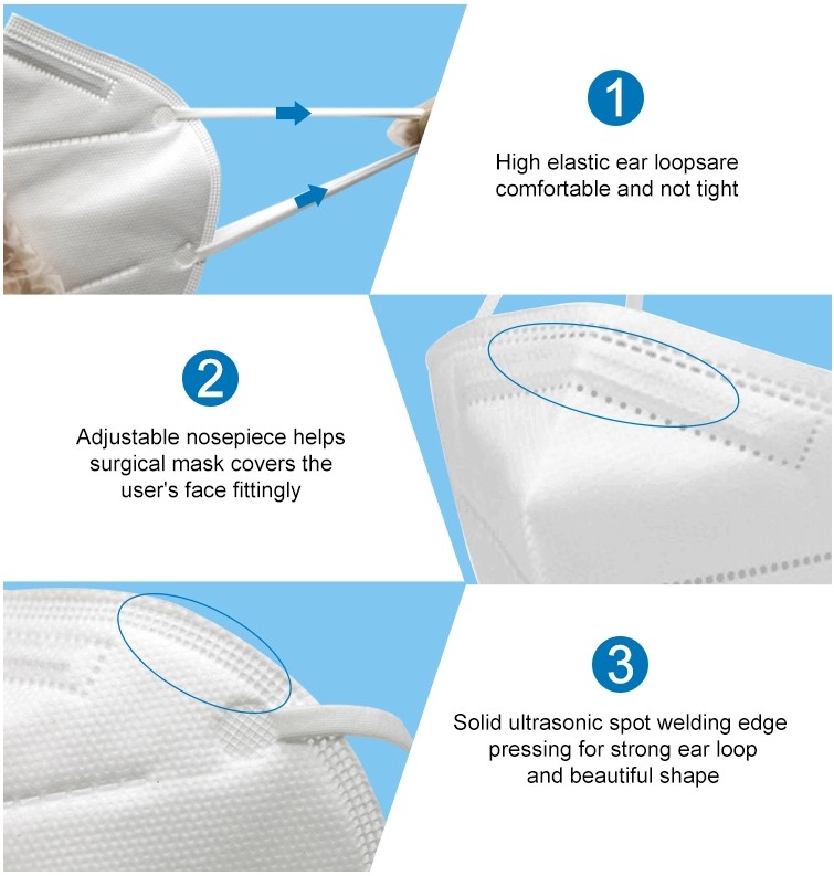 | Značajka | Podesivi komad nosa, elastična ulica, 4 sloj maska |