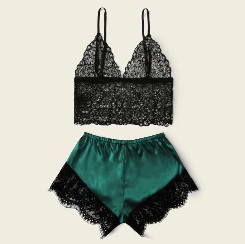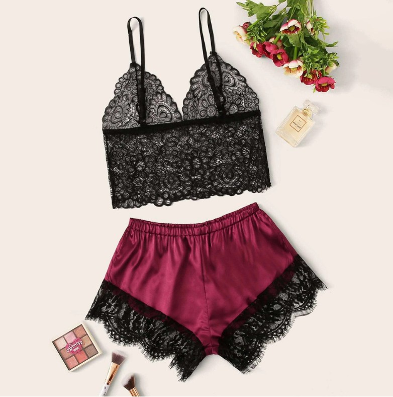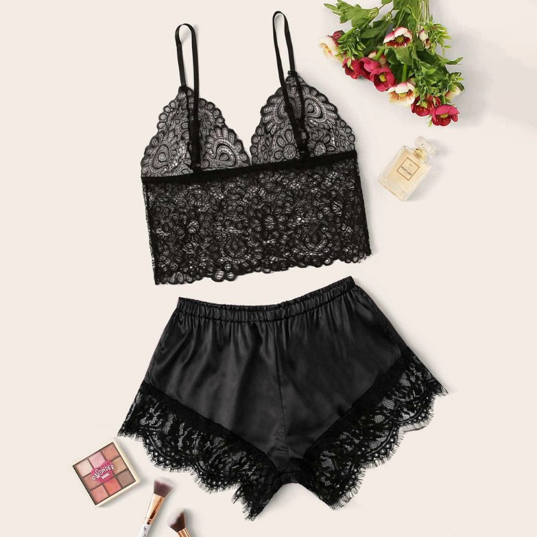 Mulleres por xunto pixama de satén Set Lencería de encaixe transparente