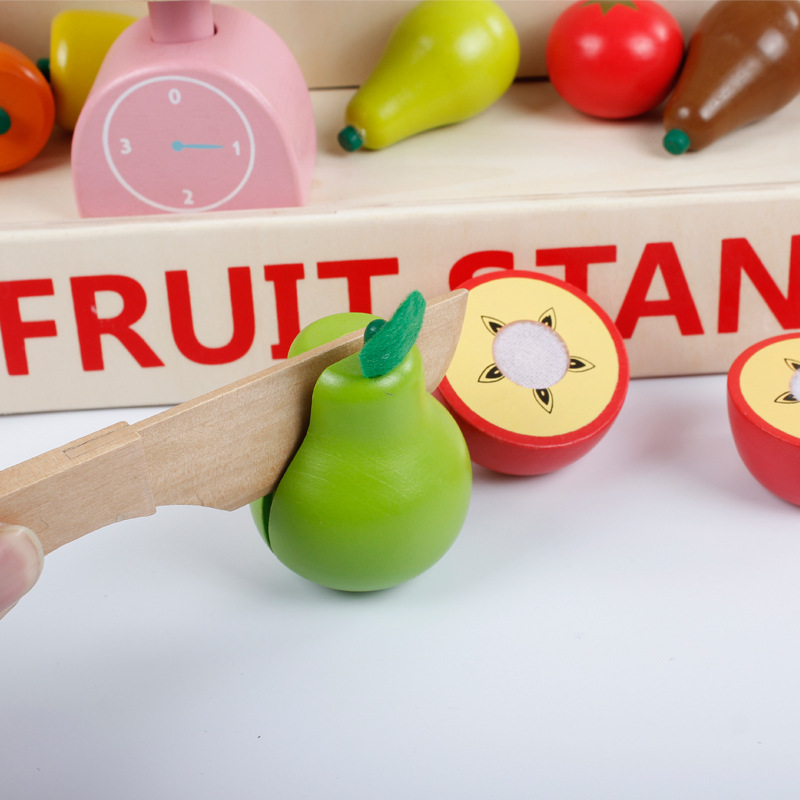 ಹೊಸ ಶೈಲಿಯ ಮರದ ನಟನೆ ಆಟವು ಮಕ್ಕಳಿಗಾಗಿ ಹಣ್ಣಿನ ಆಟಿಕೆಗಳನ್ನು ಕತ್ತರಿಸುವುದು ಮರದ ಹಣ್ಣು ಸ್ಟ್ಯಾಂಡ್ ಆಟಿಕೆ ರೋಲ್ ಪ್ಲೇ ಆಟ ಪ್ರಚಾರಕ್ಕಾಗಿ