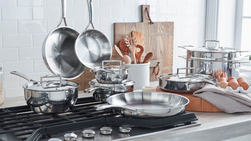 18/10 or 18/8 multi-piece sets, tri-ply/5-ply clad pans, professional-grade stockpots, and impact-bonded base cookware. Strong lasting power, a surface that does not react (so it leaves food taste alone), and a fine, shiny, or rough look. This type stands as a basic choice in work kitchens because it fights off rust and marks well.